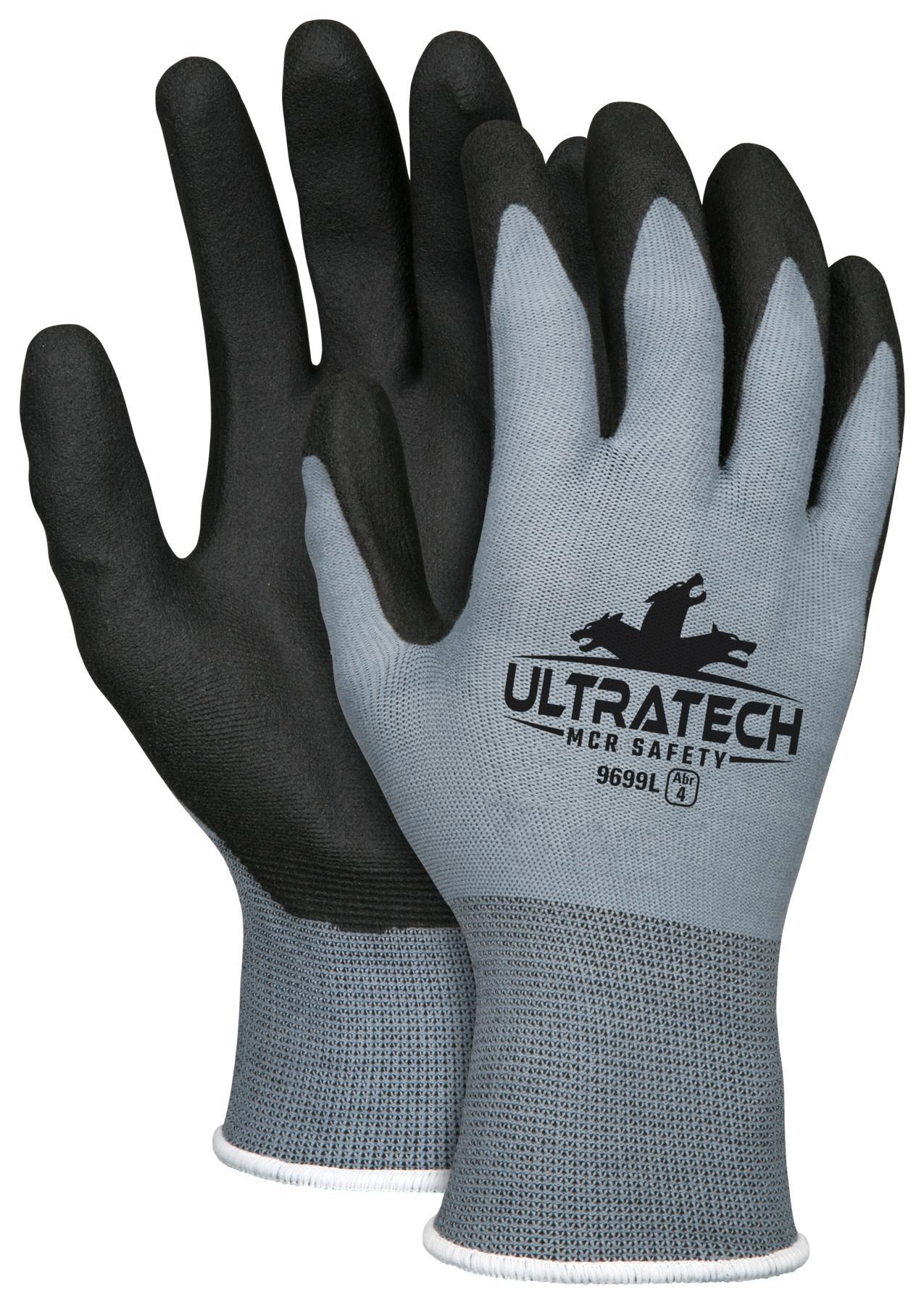 MCR Safety General Purpose Gloves, Dipped, Series: UltraTech® 9699, Coated Glove, M, HPT™ Palm, 15 ga Nylon, Black/Blue, Standard Finger, Nylon, Knit Wrist Cuff, HPT™, Coating Coverage: Fingers and Palm, 10.04 in Length, Resists: Abrasion, Cut, Puncture and Tear