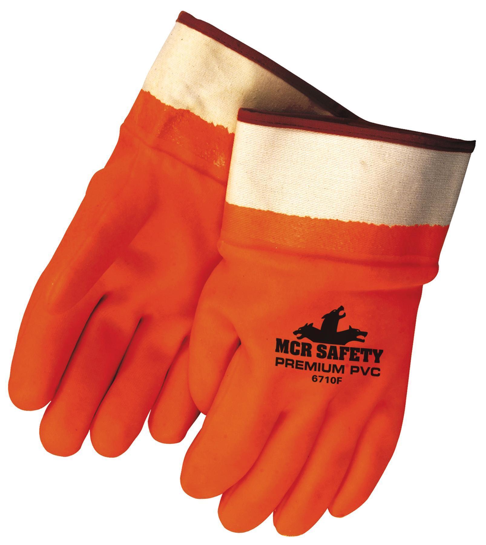 Frigid frozen fingers, no frickin' way, these foam-insulated gloves keep hands warm and dry. They are resistant to abrasions, oil, acids, chemicals and caustics. The 6710F is double dipped in PVC and has a sandy finish. It is fluorescent orange, foam lined, and has a safety cuff.