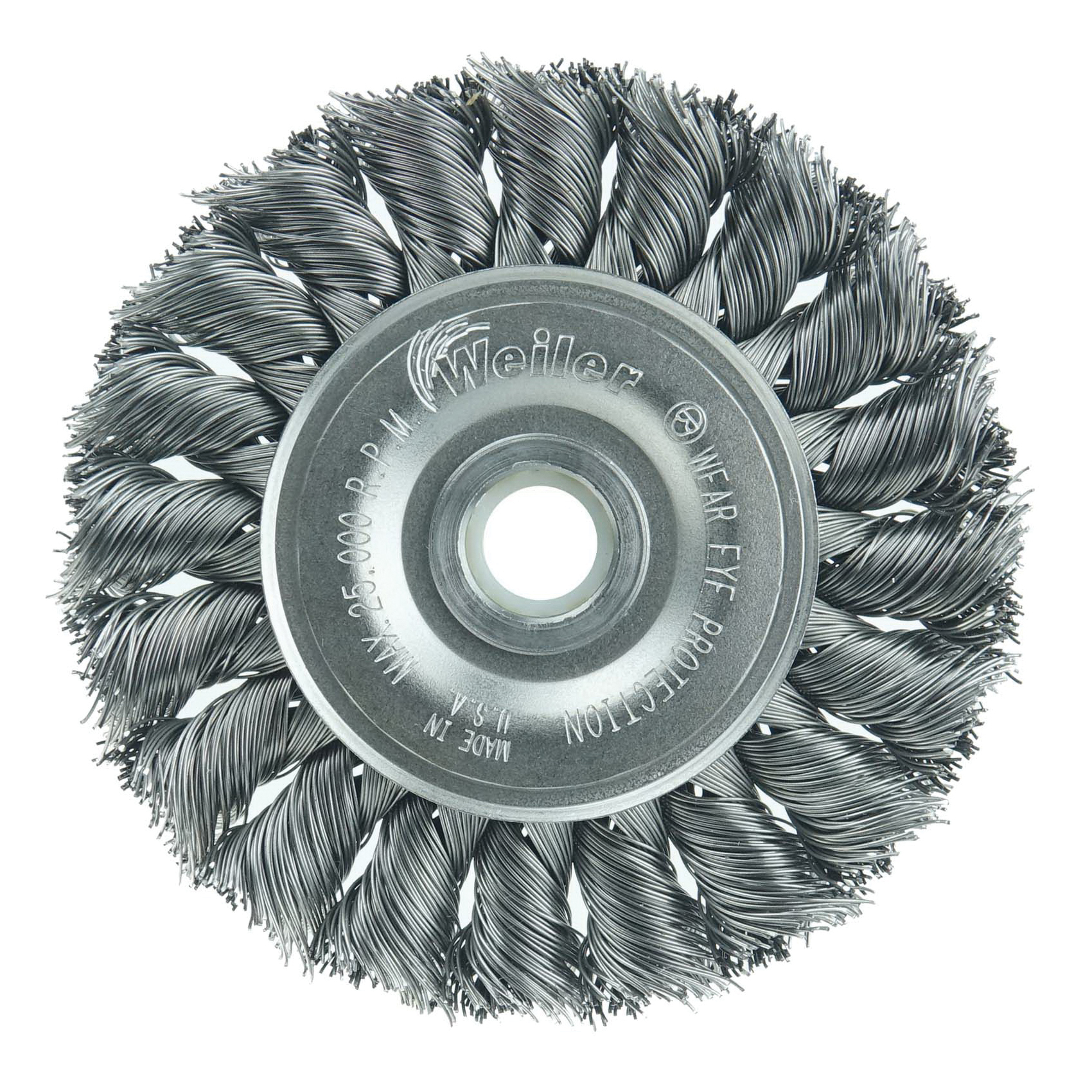 Weiler®, 08014, Wheel Brush, Heavy-Duty, Series: ST-3, 3 in Diameter Brush, 3/8 in Face Width, 1/2 to 3/8 in Arbor Hole, Standard/Twist Knot Filament/Wire, 0.014 in Dia Filament/Wire, Steel Fill, 5/8 in Trim Length, 25000 rpm Maximum, Unthreaded Arbor Attachment