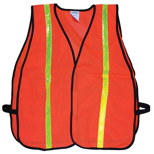 Diamond M 20100 Series High Visibility Safety Vest, Non-Rated, Universal size, Hi Vis Orange with Yellow reflective, Polyester Mesh Front & Back, Hook & Loop closure. Has elastic side straps for universal fit.