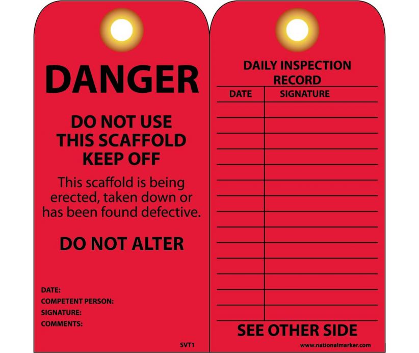 NMC™ Accident Prevention Tag, 2 Sides, DANGER - DO NOT USE THIS SCAFFOLD - KEEP OFF - THIS SCAFFOLD IS BEING ERECTED, TAKEN DOWN OR HAS BEEN FOUND DEFECTIVE, Black on Red Legend/Background, 6 in Height, 3 in Width, Vinyl, Eyelet Grommet