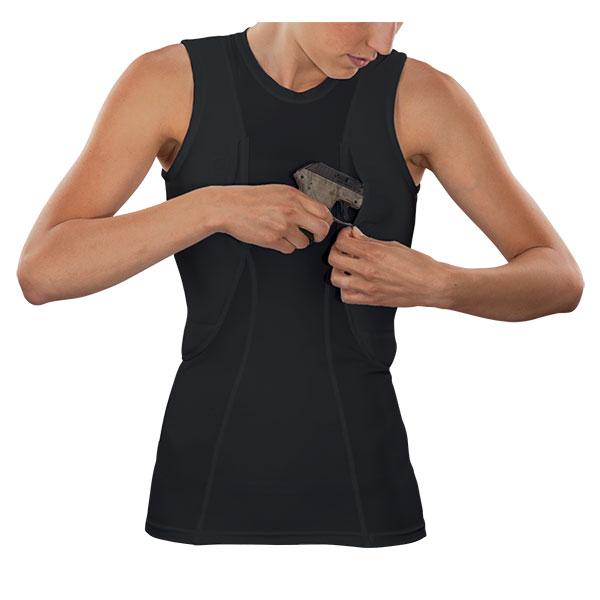 The Holster Shirt allows you to comfortably and confidentially carry a sidearm beneath a dress shirt or other professional garment when holster carry isn't appropriate or practical. Designed specifically for women, the new Sleeveless concealed carry Holster Shirt features a mesh shoulder yoke that evenly distributes the weight and an outer mesh layer prevents printing to adequately conceal the firearm. The inner neoprene layer cushions while terry cloth wicks away moisture. Poly/spandex fabric. A durable mesh shoulder yoke evenly distributes the weight of the concealed holster, preventing telltale sagging of the garment.
