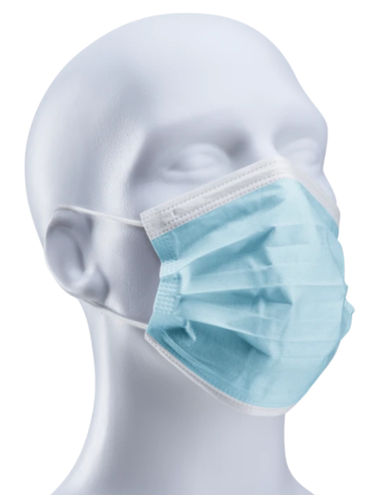 Easy to wear 3-ply mask has inner polypropylene skin friendly layer, middle melt-blown layer and blue outer fluid resistant polypropylene layer. Soft, lightweight and comfortable. Not for medical use.