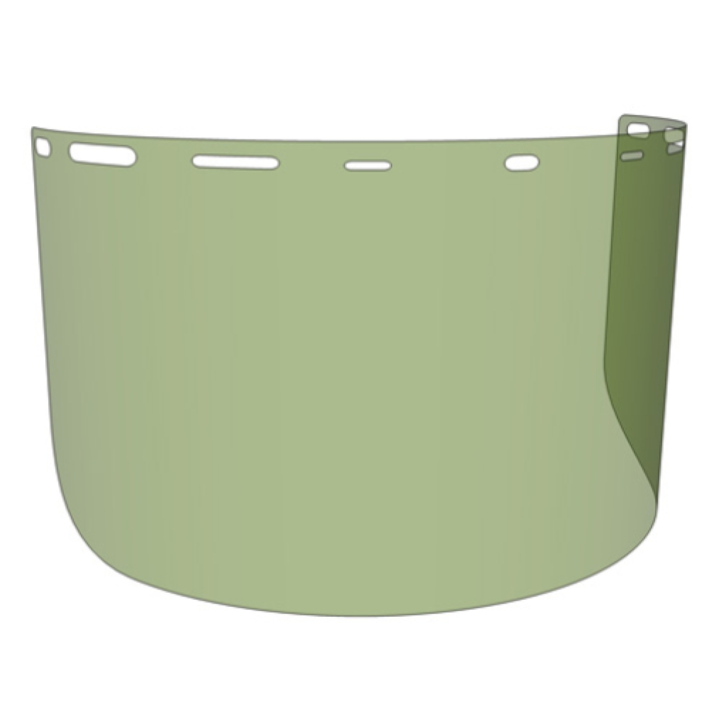 Diamond M DM-HD10203 Replacement Faceshield / Visor, Medium Green. PETG 8.5 in high x 15.5 in wide x .040 in thick. Flat packed 100/case with protective film. Universal hole pattern.