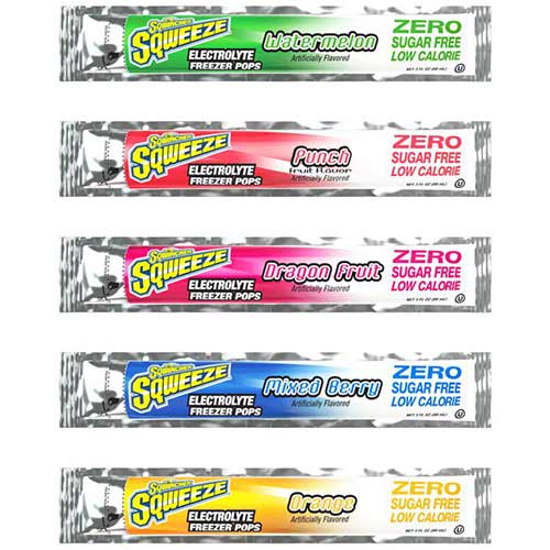 Sqwincher® Sqweeze® freezer pops are available to freeze and eat. Sugar-free freezer pops are designed for healthy electrolyte replacement, to help keep body hydrated, and cool core temperature. Electrolytes regulate body fluids during workouts and help prevent cramps and fatigue. Ideal for high-heat environments to reduce heat stress related illness. Just tear open and enjoy. Single-serve packets.