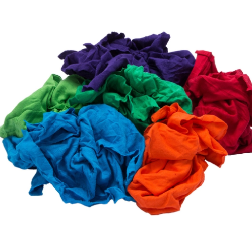 Wise Supply Reclaimed Mixed Colors T-Shirt Rags. Cotton Jersey T-shirt material is soft, very absorbent with low lint. Ideal rag for general wiping and polishing.