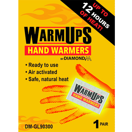 WarmUps 2.25 in x 4 in 12-hr Air-Activated Hand Warmers. Rectangular shaped single-use air-activated heat packs that provide up to 12 hours of continuous warmth for hands. 40 pair per box.