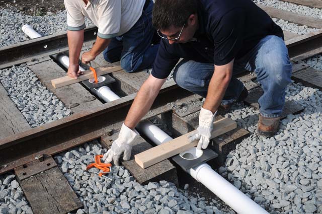 The composite model Ultra-Track Pans have been designed to provide railroad spill containment at industrial rail sidings and locomotive maintenance facilities. The twenty-foot-long pans can be connected and used for spill control for everything from small drips during maintenance to catastrophic spills from tanker cars.