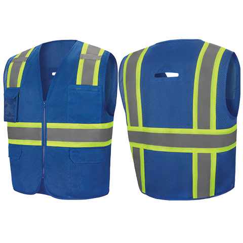 High Visibility Safety Vest, Multi Pocket, Type 0 Mesh, S, Blue, Polyester Mesh, Contrasting Lime Stripe, Plastic Front Zipper Closure, 6 Pockets, ANSI Class 1