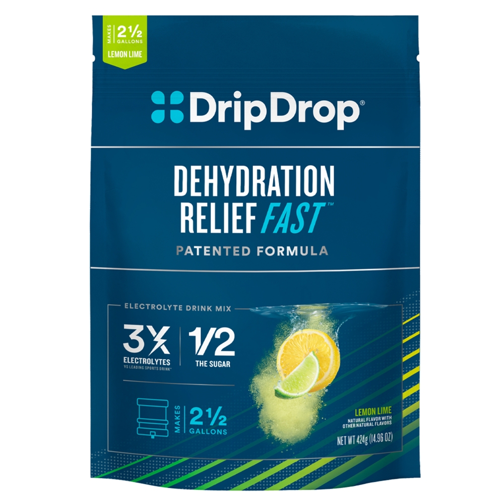 DripDrop 2.5 gallon (320 oz) Lemon Lime Bulk Pouch, 12/case INGREDIENTS: SUGAR, FRUCTOSE, CITRIC ACID, SODIUM CITRATE, POTASSIUM CITRATE, NATURAL FLAVOR, DEXTROSE, MAGNESIUM CITRATE, SILICON DIOXIDE, SALT, ASCORBIC ACID (VITAMIN C), TURMERIC FOR COLOR, SUCRALOSE, ZINC ASPARTATE.