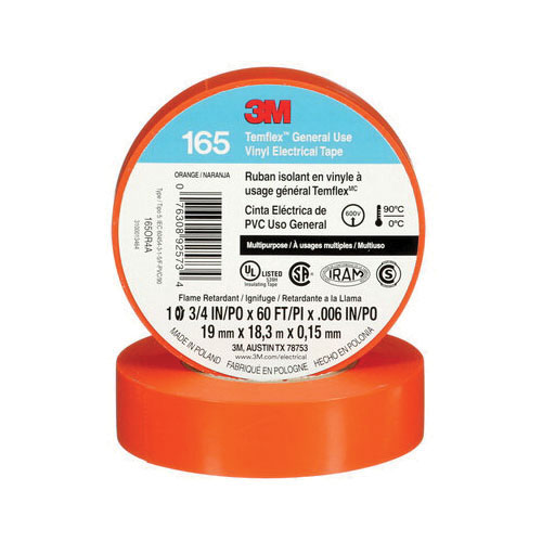 3M™ Temflex™ Vinyl Electrical Tape 165 is a good quality, multi-purpose vinyl insulating tape. It has great resistance to moisture and varying weather conditions. It is a polyvinyl chloride (PVC) tape that is flame-retardant and conformable. 3M Temflex 165 Tape provides great mechanical protection with minimum bulk. It is a UL Listed and CSA Certified “Insulating Tape.” No solvents are used in the manufacturing process. Use 3M™ Temflex™ 165 Vinyl Electrical Tape for wire and cable primary insulation (low voltage), repairs and harnessing. This professional grade tape provides enhanced performance and is suitable for indoor and outdoor use.